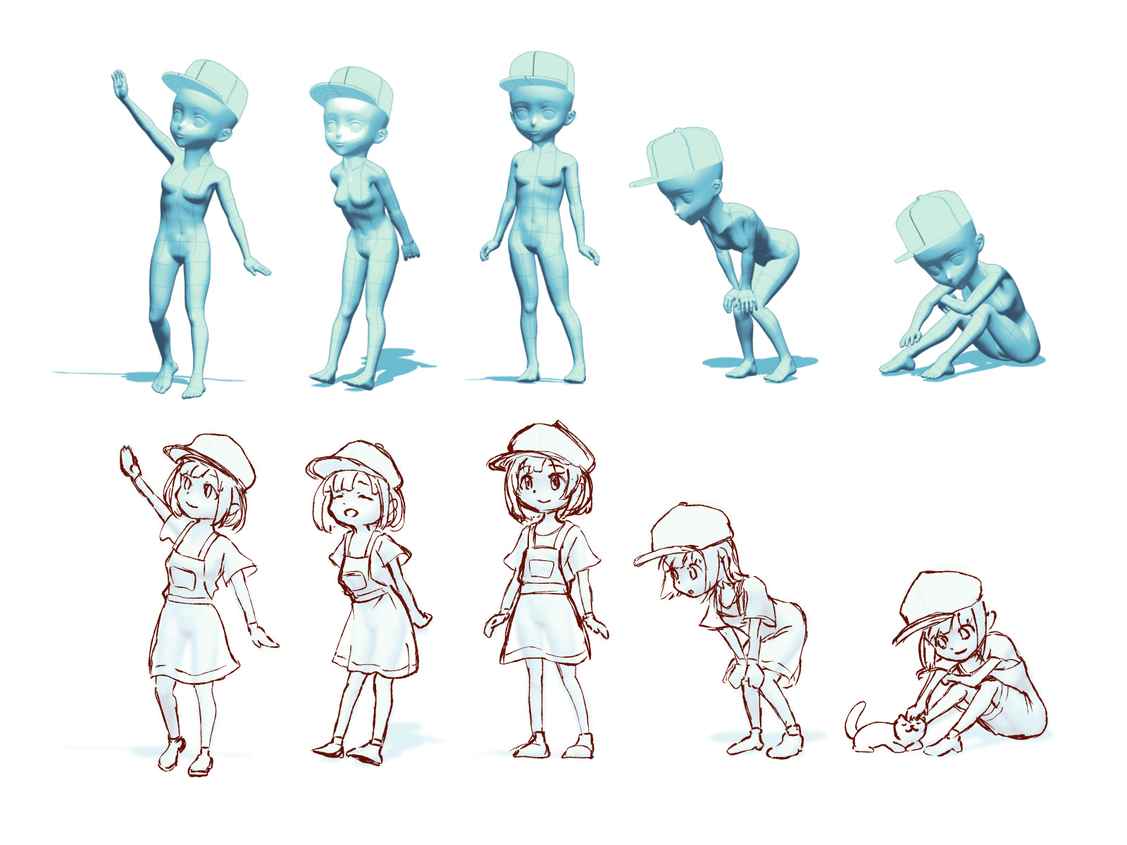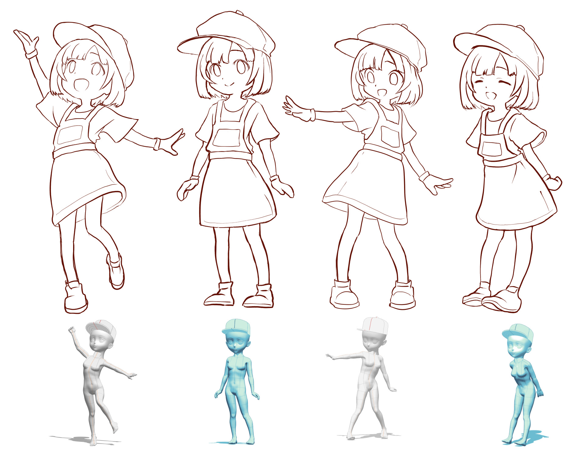というか自分のレベルで同一キャラの複数ポーズを描こうと思ったら、 体のパーツの位置関係に整合性を持たせるために 3D デッサン人形のアタリが必須だった。 (プロのアニメーターの人とかはこういうのを使わずにキャラクターの色んなポーズを描くのだろうけど、自分からすれば神の所業のように思える)