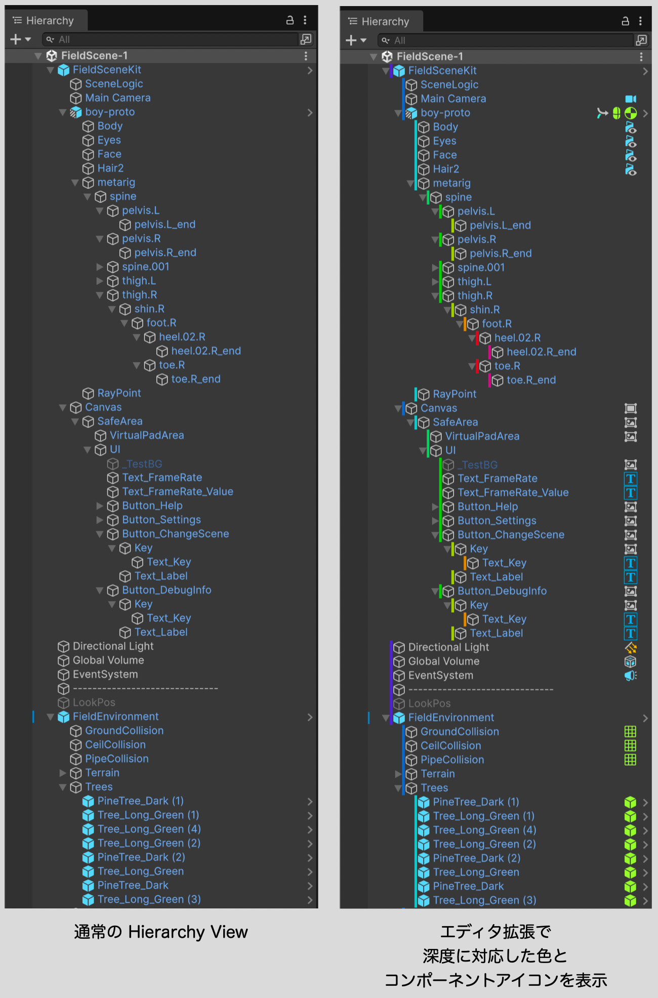 ◆ Hierarchy 上に階層に応じた色や、主要コンポーネントアイコンを表示して探しやすくするやつ